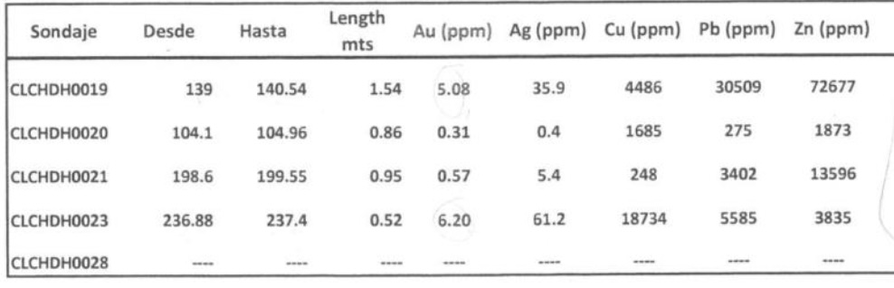 Se dispone de un paquete extenso de certificados de análisis históricos (ensayes) que incluyen muestras de tipo “drill core” y “core pulp”, además de análisis multielemento. En páginas revisadas se observan registros con valores reportados sobre límites superiores del método en algunas tablas (por ejemplo, Au reportado como “>5” y Cu reportado como “>10.000” en formatos de tabla específicos), lo que sugiere ocurrencias puntuales de leyes altas.